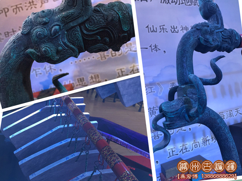 公司復(fù)原制作的32件曾侯乙編磬與原文物一致,編磬全長2.23米,寬50厘米,高1.08米;為了演奏方便,公司設(shè)計(jì)了編磬木桌承托編磬,長2.4米,高70厘米,寬45厘米,陳列編磬后總高度:1.78米。木桌內(nèi)做儲(chǔ)藏柜,可方便樂隊(duì)保管其他樂器及服裝,方便實(shí)用。