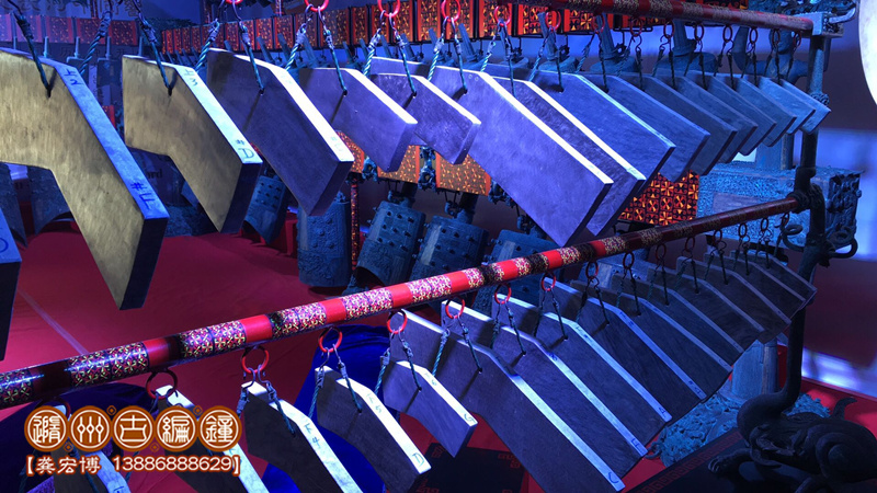 隨州市古編鐘文化發(fā)展有限公司通過考證歷史資料進(jìn)行研究分析,并八方尋找石源,終于將這套2400多年前的戰(zhàn)國初期大型編磬復(fù)制出來,其發(fā)音與原編磬的標(biāo)音銘文相符,低音渾厚洪高,高音明澈,音色優(yōu)美而動(dòng)聽,音域達(dá)三個(gè)八度,可以旋宮轉(zhuǎn)調(diào),演奏多種樂曲。